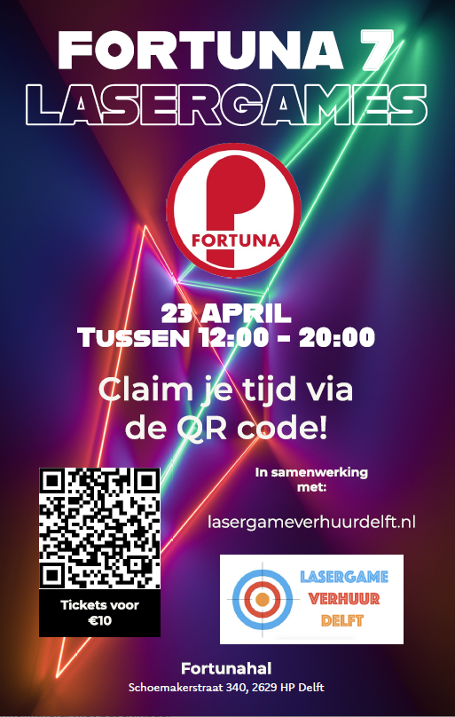Op zondag 23 april wordt de Fortuna-hal omgetoverd in een waar lasergame-walhalla! Het zevende organiseert speciaal voor project 600 een lastergamedag bij Fortuna. Echt iedereen mag komen, dus je teamleden hoeven niet per se lid van Fortuna te zijn. Van 12.00 tot 20.00 staat de Fortuna-hal volledig in het teken van spel, actie & plezier!