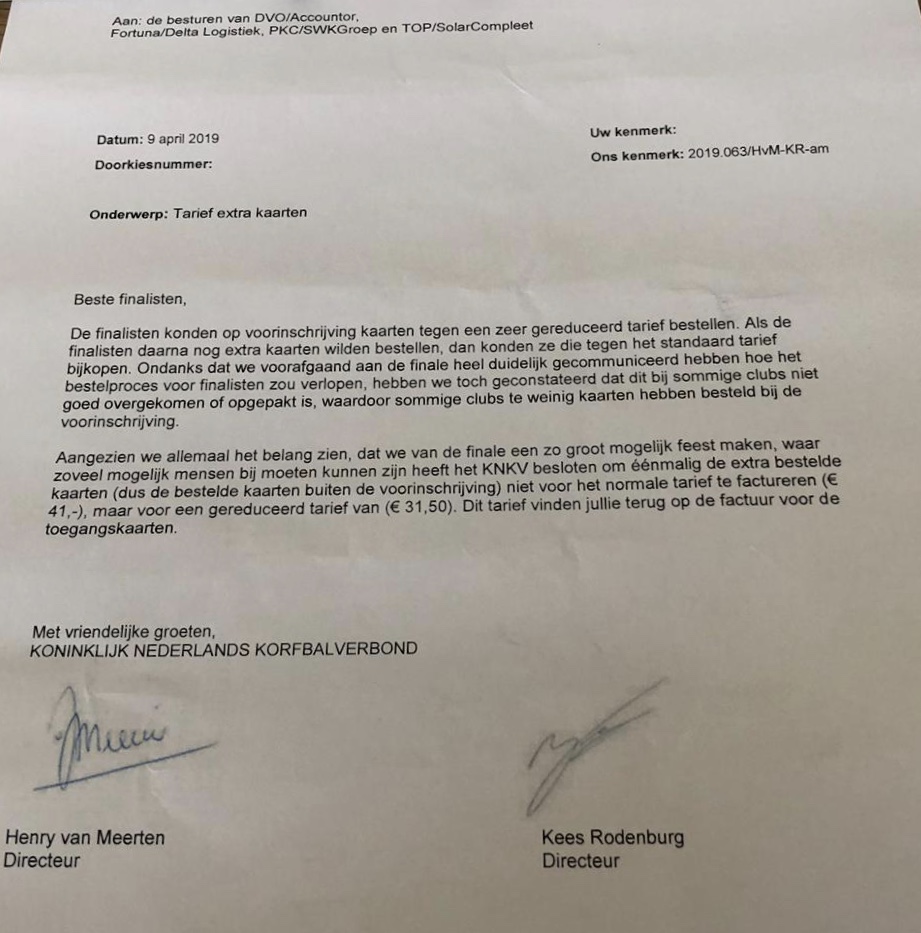 Het KNKV heeft besloten om éénmalig de extra bestelde kaarten (de kaarten buiten de voorinschrijving) voor de finalisten te verlagen (zie schrijven). Hiervoor zijn wij het KNKV zeer erkentelijk in het tegemoet komen van de deelnemende finalisten.