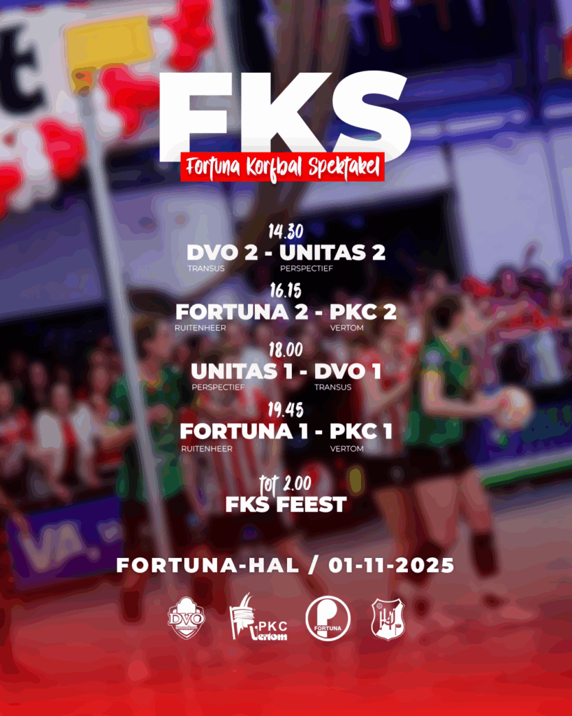 19:45 uur Fortuna 1 – PKC 1 met aansluitend korfbalfeest (vanaf 20.15 uur betreft voor iedereen de entree 5 euro, voor 20.15 uur binnen = geen entree betalen)